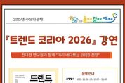 【뉴스라이트 = 이세현 기자】 인천광역시교육청서구도서관은 11월 26일 오후 7시부터 9시까지 『트렌드 코리아 2026』의 공동 저자 전다현 연구원을 초청해 ‘미리 내다보는 2026 전망’ 강연을 진행한다. 이번 강연은 서구도서관의 대표 인문학 프로그램인 '수요인문학'의 일환으로, 함께읽기 프로그램과 연계해 온라인(ZOOM)으로 운영된다. 서울대 소비트렌드분석센터 전다현 연구원이 ‘HORSE POWER’를 핵심 키워드로 인공지능(AI) 대전환 시대의 변화와 대응 전략을 이야기할 예정이다. 참가 신청은 11월 12일 오전 10시부터 서구도서관 누리집에서 가능하며, 자세한 사항은 독서문화과로 문의하면 된다.