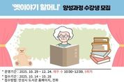 【뉴스라이트 = 박현서 기자】 안성시 중앙도서관은 오는 10월 29일부터 12월 24일까지 매주 수요일 오전 10시부터 12시까지(총9회) 진행되는 『옛이야기 할머니』양성과정의 수강생을 모집한다. 이번 과정은 우리 전통 설화와 구전문화를 이해하고, 이를 바탕으로 어린이들에게 옛이야기를 들려줄 수 있는 이야기 구연 역량을 키우는 특화 교육 프로그램으로 교육은 송경애 강사(한국국학진흥원 및 아름다운 이야기 할머니 교육강사)가 진행하며, 이야기 전달 기법, 발성 훈련, 스토리텔링 실습 등 실질적인 교육 중심으로 구성된다. 참여 대상은 60세 이상 여성 20명으로, 접수는 10월 14일부터 도서관 홈페이지, 전화 또는 방문을 통해 신청할 수 있다. 도서관 관계자는 “지역 어르신들이 삶의 지혜와 전통 이야기를 전하며 세대 간 소통의 다리를 놓는 뜻깊은 과정이 될 것이고 본 과정을 수료한 참여자들은 2026년 ‘책 읽어주기’ 자원봉사 프로그램에 참여할 수 있도록 안내할 계획이다.”라고 전했다.