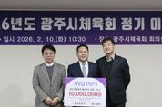 【뉴스라이트 = 김정민 기자】 광주시에 소재한 ㈜대광레미콘 진성재 대표가 지역 체육 발전을 위해 광주시체육회에 기부금 1천만 원을 전달했다. 기부금 전달식은 지난 10일 광주시 G-스타디움 내 광주시체육회 대회의실에서 열린 2026년 제1차 정기 이사회 중 진행됐으며 체육회 관계자들이 참석한 가운데 이뤄졌다. 이번 기부금은 지역 체육 활성화와 선수 육성, 체육 환경 개선 등 광주시 체육 진흥을 위한 사업에 활용될 예정이다. 진성재 대표는 “지역 체육이 건강하게 성장하는 데 조금이나마 보탬이 되길 바란다”며 “앞으로도 지역 사회와 함께하는 나눔과 상생을 지속적으로 실천해 나가겠다”고 말했다. 이에 대해 박범식 광주시체육회장은 “지역 체육 발전을 위해 따뜻한 나눔을 실천해 주신 진성재 대표와 ㈜대광레미콘에 감사드린다”며 “기부의 뜻이 현장에서 실질적인 성과로 이어질 수 있도록 책임감 있게 활용하겠다”고 밝혔다. 한편, 광주시체육회는 앞으로 민관 협력을 통해 지역 체육 기반을 강화하고 시민 누구나 체육 활동에 참여할 수 있는 환경 조성에 주력할 방침이다.