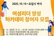 【뉴스라이트 = 박현서 기자】 안성시는 지역사회 발전을 이끌 열정있고 능력있는 여성 지도자를 발굴·육성하기 위해 ‘2025년 안성시 여성리더 양성 아카데미’ 기본과정 교육 참가자를 모집한다. 이번 아카데미는 적극적으로 참여할 수 있는 여성 시민 누구나 신청할 수 있으며, 신청기간은 오는 10월 15일부터 시작된다. 교육은 11월 5일부터 12월 10일까지 6주간 매주 수요일에 안성시여성비전센터 (발화대길 25) 1층 공유오피스에서 진행 될 계획이다. 교육 내용은 ‘나는 당신이 행복했으면 좋겠습니다.’ 라는 주제로 김경희 강사의 행복소통 리더십 강의로 개강식을 열고 2~3주차는 감성을 담아 나를 알리는 SNS 활용법 이론편과 실습편, 4~5주차에는 나만의 비서 만들기 챗봇과 생성형 AI교육 이론편과 실습편을 구성하여 최신 트렌드에 맞춘 리더 역량 강화를 위한 강의들로 구성했으며 6주차에는 퍼실리테이션 기법을 활용하여 지역 내 현안 문제를 파악하고 리더로서 해결 방법을 제시하는 과정을 마지막으로 수료식을 가질 예정이다.