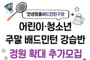 【뉴스라이트 = 박현서 기자】 안성시시설관리공단은 안성 시민 생활체육 활성화를 위해 현재 운영 중인 주말 어린이・청소년 배드민턴 강습반 정원을 확대하고 추가 수강생을 모집한다고 밝혔다. 이번 주말 어린이・청소년 배드민턴 강습반은 개설 이후 학부모와 수강생들의 높은 관심 속에 연일 정원이 마감될 정도로 큰 호응을 얻고 있다. 특히 주말을 활용해 어린이와 청소년들이 체계적으로 생활 체육을 접할 수 있다는 점에서 학부모들의 만족도가 높은 프로그램으로 자리 잡고 있다. 공단은 이러한 시민 수요를 적극 반영하기 위해 강습반 정원을 기존보다 확대하고, 오는 3월 23일 오전 9시부터 3월 31일 오후 10시까지 초등학생부터 고등학생까지의 어린이·청소년을 대상으로 선착순 10명을 추가 모집한다. 신청은 실내체육관 사무실에 전화로 문의한 뒤 방문 접수로 진행될 예정이다. 이정찬 이사장은 “시민들의 높은 관심에 부응하기 위해 앞으로도 누구나 쉽게 참여할 수 있는 생활체육 환경을 만들어 가겠다”고 전했다. 현재 안성시시설관리공단에서는 시민들의 건강증진을 위하여 주말 강습반 외 매주 2회(화,목) 오전‧오후‧저녁‧시니