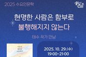 【뉴스라이트 = 이세현 기자】 인천광역시교육청서구도서관은 10월 29일 오후 7시부터 9시까지 『어른의 행복은 조용하다』의 저자 태수 작가를 초청해 ‘수요인문학’ 강연 ‘현명한 사람은 함부로 불행해지지 않는다’를 진행한다. ‘수요인문학’은 서구도서관이 2020년부터 운영해온 대표 인문학 프로그램으로, 올해 하반기부터는 대면과 비대면 방식을 병행해 운영되고 있다. 이번 강연은 함께읽기 프로그램과 연계해 도서관 1층 북카페에서 진행되며, 태수 작가가 일상 속 작은 행복과 마음의 균형을 주제로 강연한다. 참가 신청은 10월 17일 오전 10시부터 가능하며, 자세한 사항은 서구도서관 누리집 또는 독서문화과로 문의하면 된다.