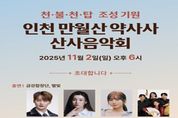 【뉴스라이트 = 이세현 기자】 인천광역시는 오는 11월 2일 오후 6시, 남동구 간석동 만월산 약사사에서 ‘만월산 약사사 산사음악회’를 개최한다고 밝혔다. 이번 음악회는 인천시가 후원하고 인천불교총연합회가 주최, 약사사가 주관하는 가을 대표 문화행사로, 도심 속 사찰을 문화무대로 확장해 시민이 함께 즐길 수 있는 열린 힐링 축제로 기획됐다. 1932년 창건된 약사사는 대한불교화엄종의 총본산으로, 도심 속에서도 고요함과 전통미를 간직한 인천의 대표 사찰이다. 이번 공연은 ‘종교를 넘어 시민 모두가 행복을 나누는 시간’을 주제로, 불교문화와 대중음악이 함께 어우러지는 색다른 감동의 무대가 될 전망이다. 약사사 금강합창단의 찬불가 무대로 시작해 불교적 선율 속에 마음의 평안을 전한다. 이어 퓨전국악그룹‘이상’이 전통 국악과 현대적 리듬을 결합한 색다른 무대를 선보이며, 색다른 음악적 감성을 선사한다. 또한 가수 박서진, 나영, 정슬, 별빛 등 대중에게 사랑받는 초대가수들이 트로트와 감성가요를 통해 남녀노소가 함께 즐길 수 있는 다채로운 무대를 펼칠 예정이다. 윤도영 시 문화체육국