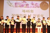【뉴스라이트 = 이양지 기자】 안양시는 20일 오후 2시 시청 강당에서 제46회 장애인의 날 기념식을 열고 장애인과 비장애인이 함께 어우러지는 화합의 장을 마련했다고 밝혔다. '당연한 일상, 모두가 누릴 수 있도록'을 주제로 (사)안양시장애인단체총연합회가 주관한 이날 행사에는 관내 장애인 단체 회원과 장애인 복지 시설 종사자, 시민 등 900여 명이 참석했다. 기념식 행사는 장애인 인권 헌장 낭독을 시작으로 장애인 인권·복지 증진에 기여한 모범 장애인과 장애인 복지 유공자 등 30명에 대한 표창 수여, 저소득 이웃을 위한 안양시장애인단체총연합회 생활지원금 전달 순으로 진행됐다. 특히 이날 행사는 장애인들이 직접 주도하는 문화 축제 형식으로 꾸며졌다. 'KBS 아침마당-도전 꿈의 무대' 우승자인 장애인 가수 임일주 씨의 축하 공연을 비롯해 장애인복지회 소속 '소소별별'의 악기 연주, 장애인 부모연대의 경기민요 공연이 이어져 참석자들의 호응을 얻었다. 시청 홍보홀과 민원실 앞 광장에서는 장애인의 자립을 보여주는 부대 행사도 마련됐다. 발달 장애인 바리스타가 운영하는 이동식 카페 '마카롱'이 문을 열었고