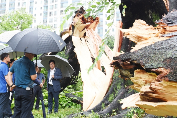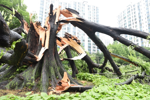 【뉴스라이트】 보호수로 지정된 수원 영통구 단오어린이공원 내 느티나무가 26일 강풍에 쓰러졌다.