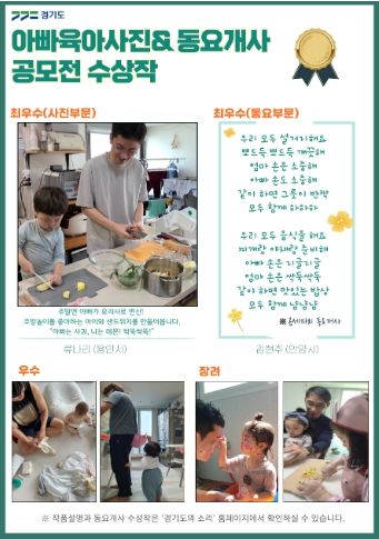 경기도는 성평등 문화 확산을 위해 지난 4월 ‘아빠육아사진&동요개사’ 공모전을 진행한 결과 류나리 씨 등 총 10편의 수상작을 선정했다고 9일 밝혔다.