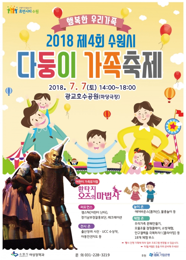 이날 축제는 어린이 가족뮤지컬 ‘환타지 오즈의 마법사’, 잼스틱(어린이 난타), 레크리에이션 등 프로그램으로 진행된다. 다둥이 가족뿐 아니라 모든 시민이 참여할 수 있다. 행사는 오후 6시까지 이어진다.
