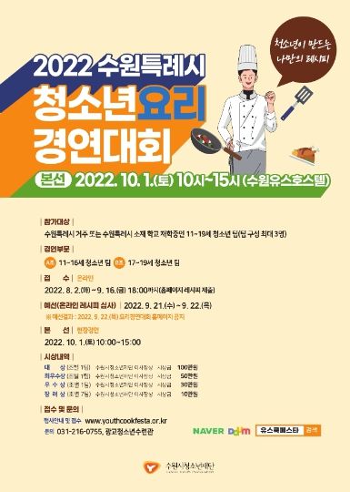 【뉴스라이트 = 조용은 기자】 수원시청소년재단 광교청소년수련관은 2022. 수원특례시 청소년 요리경연대회 ‘유스(Youth) 쿡 페스타’ 참가자를 모집한다.