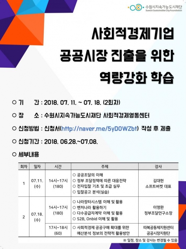 【뉴스라이트】 수원시지속가능도시재단 사회적경제지원센터는 7월 11·18일 오후 2시 사회적경제지원센터 별관(영동시장 3층)에서 ‘사회적경제기업 공공시장 진출 역량강화 학습 과정’을 연다.