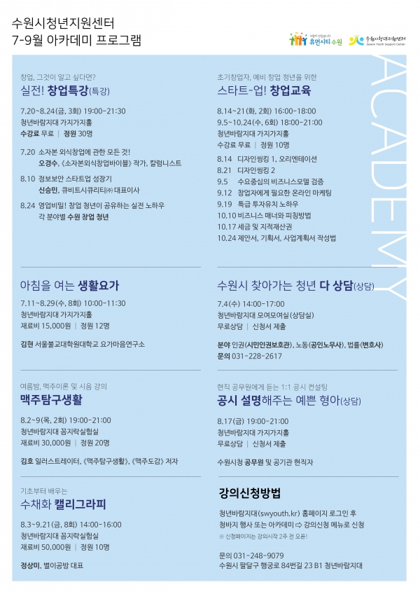 【뉴스라이트】 수원시청년지원센터가 청년들의 자기 계발과 삶의 질 향상을 위해 운영하는 수원청년아카데미 3분기 강좌가 7월 문을 연다.