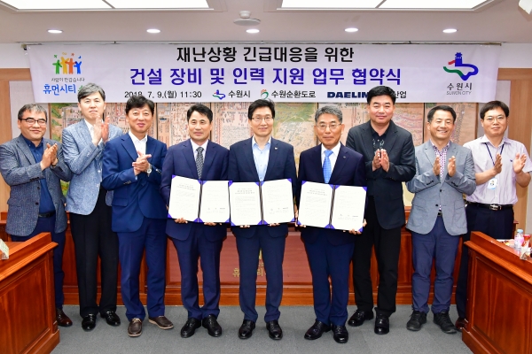 수원시와 수원순환도로(주), 대림산업은 9일 시청 상황실에서 ‘재난 상황 긴급 대응을 위한 건설 장비 및 인력 지원 업무 협약’을 체결하고, 폭우·폭설과 같은 재난 상황이 발생했을 때 적극적으로 협력하기로 했다.