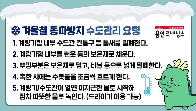 용인특례시는 11월 30일부터 내년 3월 31일까지 '겨울철 한파 대비 수도시설 동파 방지대책'을 추진한다.