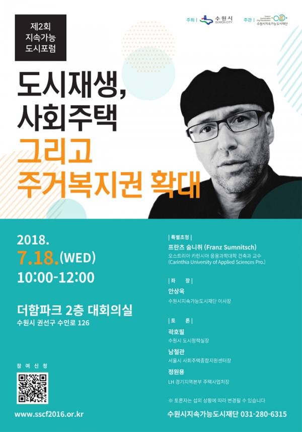 수원시지속가능도시재단이 주관하는 이날 포럼은 프란츠 숨니취(Franz Sumnitsch) 오스트리아 카린시아 응용과학대학 건축과 교수의 특별 강연과 토론으로 진행된다.