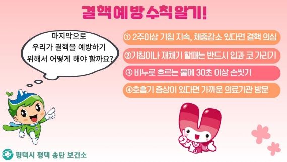 평택시 보건소 관계자는 “결핵 예방의 날(3.24.)을 계기로 결핵에 대한 시민들의 관심과 2주 이상 기침이 지속되면 검진을 받는 것이 매우 중요하다”고 당부했다.