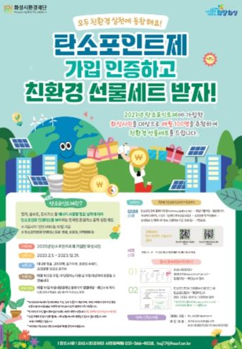 【뉴스라이트 = 조용은 기자】 (재)화성시환경재단은 오는 12월 31일까지 ‘2023년 탄소포인트제’에 신규 가입한 화성시민을 대상으로 매월 100명을 추첨해 친환경 선물세트를 증정한다.