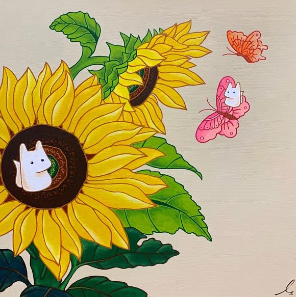김수진 작가는 우리에게 친숙한 반려동물의 여러 모습을 합쳐 놓은 듯한 ‘먕’ 캐릭터를 통해 어린 시절의 추억들을 함축적이고 유쾌한 유머로 풀어내며, 강렬한 색채와 사물 그리고 배경을 채운 공간이 서로 대비되는 팝아트적인 형식으로 표현된 새로운 시각의 회화작품을 선보인다.