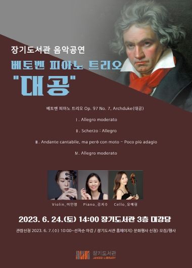 【뉴스라이트 = 이세현 기자】 김포시립 장기도서관은 오는 24일 오후 2시 바이올리니스트 이인영, 피아니스트 김지수, 첼리스트 유예림 트리오의 ‘대공 연주회’를 개최한다.