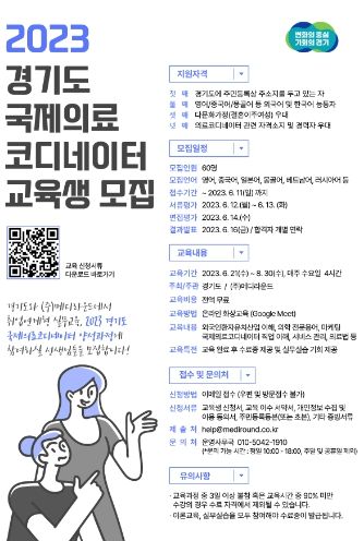 【뉴스라이트 = 조용은 기자】 경기도가 6월 11일까지 ‘2023년 경기도 국제의료코디네이터 양성 교육생’을 공개 모집한다.