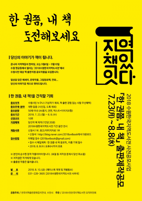 ‘한 권쯤, 내 책’ 출판 지원 공모는 지역출판 콘텐츠를 발굴하기 위해 일반 수원시민을 대상으로 개인의 책을 제작해준다.