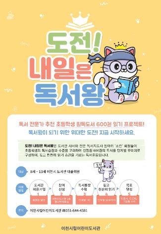 【뉴스라이트 = 김정민 기자】 이천시는 7월 4일부터 초등학생 어린이 대상 독서 프로제트 ‘도전! 내일은 독서왕’사업을 운영한다고 밝혔다.