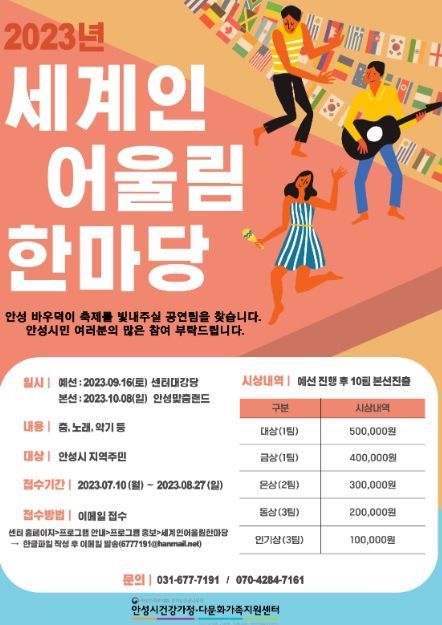 【뉴스라이트 = 박현서 기자】 안성시는 건강가정·다문화가족지원센터가 주관하는 2023년 세계인 어울림 한마당 참가자를 8월 27일까지 모집한다고 20일 밝혔다.