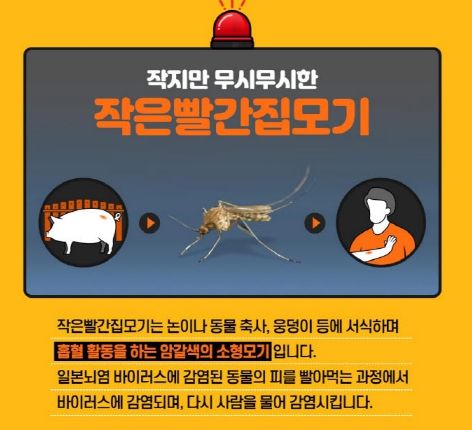일본뇌염을 전파하는 작은빨간집모기는 논이나 축사, 웅덩이 등에 서식하는 암갈색의 소형모기로 야간에 흡혈 활동하는 것이 특징이다.