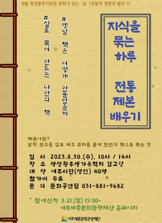 【뉴스라이트 = 김정민 기자】 여주세종문화관광재단은 오는 8월 30일, 명성황후기념관 8월 문화가 있는 날 프로그램으로 ‘지식을 묶는 하루 - 전통제본 배우기’를 진행한다.