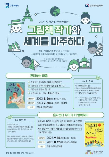 【뉴스라이트 = 조용은 기자】 수원시 영통도서관은 어린이 대상 다문화프로그램 ‘그림책 작가와 세계를 마주하다’에 참가할 초등학생 1~3학년 학생을 모집한다.