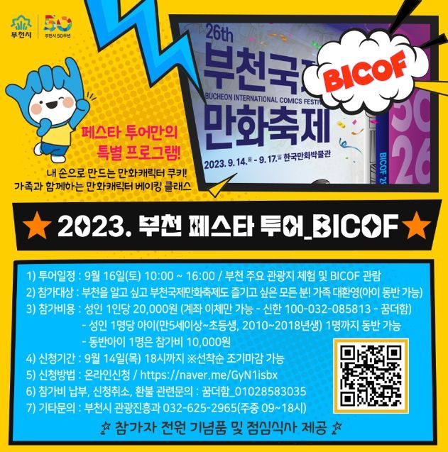 ‘부천 페스타 투어-BICOF’편은 부천국제만화축제 개막 주 토요일인 오는 16일에 1회 진행되며, 부천 주요 관광지와 부천국제만화축제를 함께 즐길 수 있는 특화 관광코스로 기획됐다.
