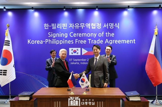 【뉴스라이트 = 이양지 기자】 산업통상자원부 안덕근 통상교섭본부장과 알프레도 에스피노사 파스쿠알(Alfredo Espinosa Pascual) 필리핀 통상산업부 장관은 9월7아세안 정상회의가 개최되고 있는 인도네시아 자카르타에서 양국 정상이 지켜보는 가운데 한-필리핀 자유무역협정(‘FTA’)에 정식 서명했다.