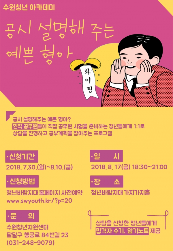 【뉴스라이트】 수원시 청년지원센터가 다음달 17일 공무원 시험(공시)을 준비하는 청년들과 현직 공무원과의 일대일 컨설팅을 지원하는 ‘공시 설명해 주는 예쁜 형아’ 특강을 연다.