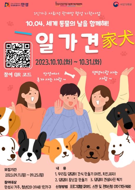 안성시건강가정‧다문화가족지원센터는 10월 4일 세계 동물의 날을 기념하여 ‘세계 동물의 날을 함께해, 일가견’ 프로그램을 진행한다고 밝혔다. 본 프로그램은 안성시에 실거주하는 청년(만20-39세) 1인가구와 함께 사는 반려견을 대상으로 강아지 간식 만들기, 장난감 만들기, 견생 한 장 사진찍기 총 3가지의 다양한 프로그램으로 구성·진행될 계획이다.