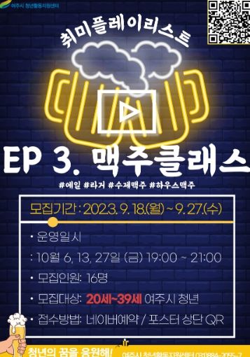 여주시 청년활동지원센터 관계자는 “맥주의 역사와 양조 과정을 배우고 다양한 맥주들을 맛볼 수 있는 시음회와 더불어 참여하는 여러 청년들과 함께 즐길 수 있는 이번 프로그램을 통해 길었던 여름을 마무리하고 가을을 맞이하는 즐거운 시간이 되길 바란다”고 말했다.