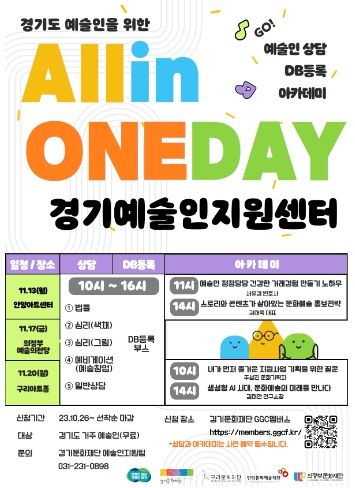 【뉴스라이트 = 조용은 기자】 경기문화재단(대표이사 유인택)은 예술인의 지속 가능한 창작활동을 지원하기 위한 ▲상담, ▲교육, ▲데이터베이스(DB) 등록을 모두 한자리에서 만나볼 수 있는 'All in One Day, 경기예술인지원센터'를 운영한다. 11월 13일 안양아트센터, 11월 17일 의정부예술의전당, 11월 20일 구리아트홀에서 열리는 이번 행사는 경기도 곳곳의 예술 현장을 찾아가고자 지역문화재단(구리, 안양, 의정부)과 협력으로 진행된다.