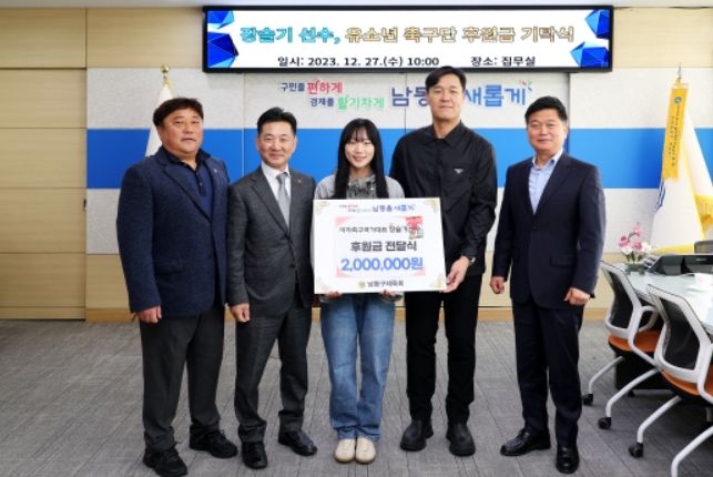 【뉴스라이트 = 이세현 기자】 인천시 남동구는 27일 여자 축구 국가대표 장슬기 선수로부터 유소년 축구단을 위한 후원금 200만 원을 기탁받았다고 28일 밝혔다.