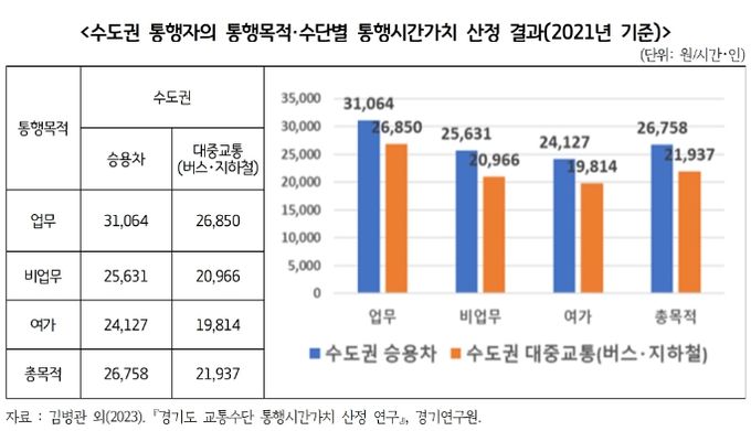 보고서에 따르면 교통정책 결정의 중요한 지표로 활용되고 있는 통행시간가치는 통행자가 1시간의 통행시간을 절감하기 위해서 지불하고자 하는 금전적 가치를 의미하고 있다. 국가 지침에서 제시된 통행시간가치는 전국 지역 간 통행을 기반으로 산정된 결과로 실제 수도권의 통행행태와 통행시간가치를 반영하기에는 한계가 있다는 지적이다. 이는 수도권의 다양한 교통 사회간접자본(SOC) 사업 계획이 타당성 확보에 어려움을 겪고 수도권의 통행 특성과 대중교통 통행의 중요성이 고려되지 못하고 있는 실정으로 나타나고 있다.