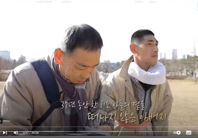 매일 아들의 대소변과 매 끼니 식사를 챙겨주고 하루 2차례씩 산책을 나갈 때면 기저귀를 채우고 허리에 끈을 묶어 한 몸으로 움직여야만 하지만 고달픈 삶을 달관한 듯한 아버지의 담담한 미소에서 진한 부정(父情)을 엿볼 수 있다.