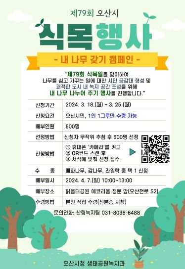 【뉴스라이트 = 조용은 기자】 오산시는 제79회 식목일을 맞아 오는 4월 7일 일요일 오전 10시부터 맑음터공원 에코리움(오산천로 52)에서 오산시민 600명을 대상으로 ‘내 나무 갖기 캠페인’을 진행할 예정이라고 전했다.