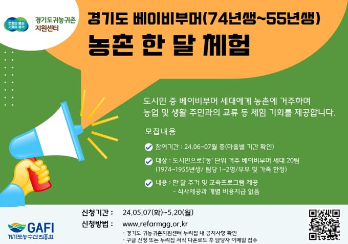 【뉴스라이트 = 조용은 기자】 경기도와 경기도귀농귀촌지원센터(경기도농수산진흥원)는 ‘베이비부머 농촌 한 달 체험’ 참가자를 7일부터 모집한다.