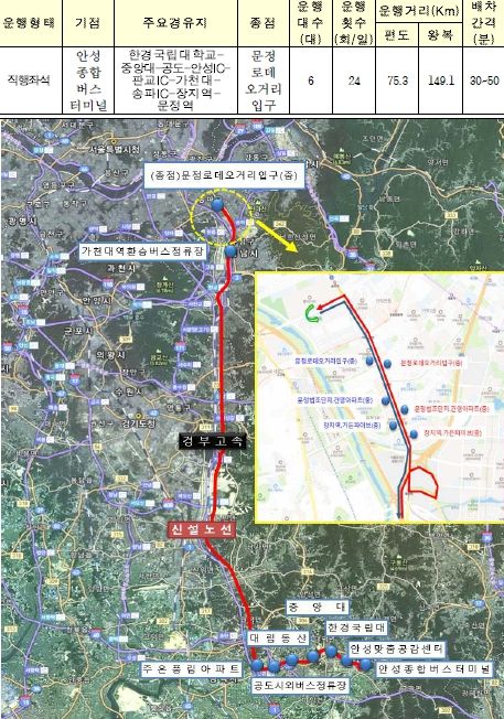 해당 노선은 안성종합버스터미널을 기점으로 가천대역환승버스정류장, 장지역.가든파이브(중) 및 문정법조단지.건영아파트(중)를 거쳐 문정로데오거리입구(중)가 종점이며, 1일 6대(24회)로 배차간격은 30~50분으로 운행할 예정이고 대광위 노선입찰 등 행정절차를 거쳐 2024년 하반기 운행될 것으로 보고 있다.