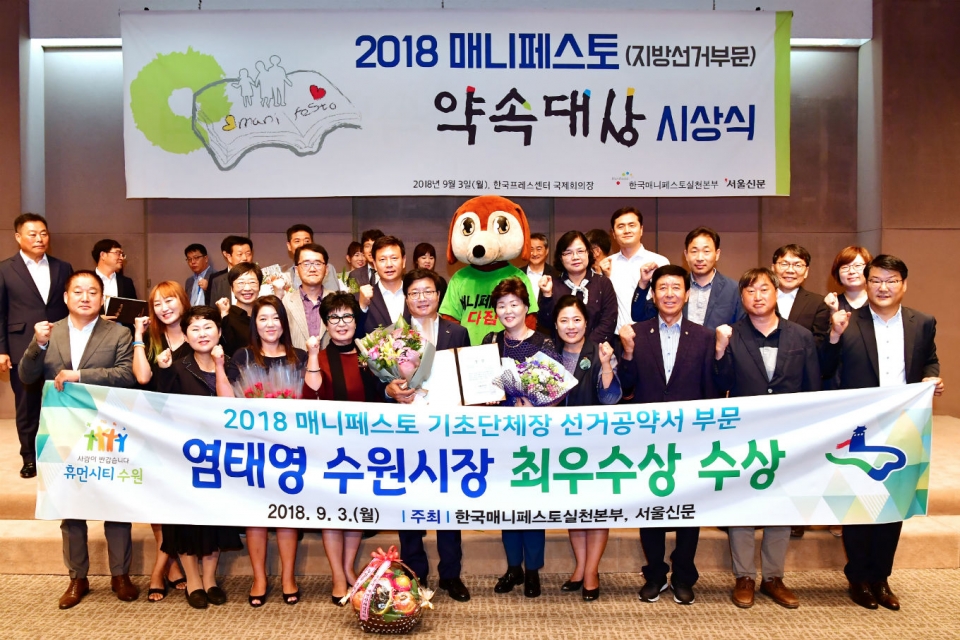 【뉴스라이트】 염태영 수원시장이 한국매니페스토실천본부가 주최하는 ‘2018 매니페스토(지방선거 부문) 약속대상’에서 최우수상을 받았다.