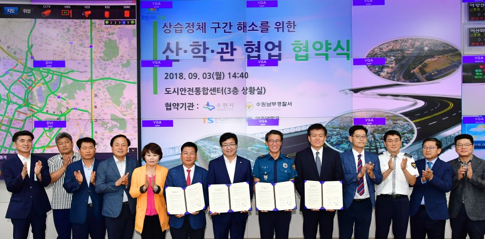 【뉴스라이트】 수원시와 수원남부경찰서, 한국교통안전공단(경기남부본부), 아주대학교는 3일 도시안전통합센터 상황실에서 ‘수원시 상습 정체 구간 해소를 위한 협약’을 체결하고, 교통체계 개선 방안을 찾기 위해 협력하기로 했다.