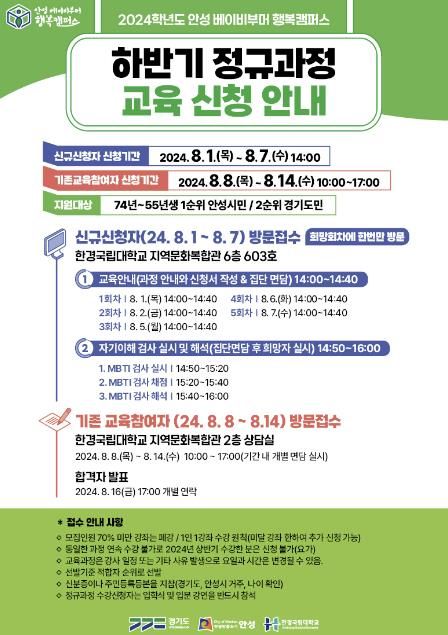 정규과정은 안성시민 1974년생부터 1955년생으로 나이 제한이 있고, 신규신청자는 8월 1일~ 8월 7일 오후 2시까지, 기존교육생은 8월 8일~ 8월 14일 오전 10시 ~ 오후 5시까지 행복캠퍼스에 방문 신청하면 되고, 수강료는 전액 무료이다.