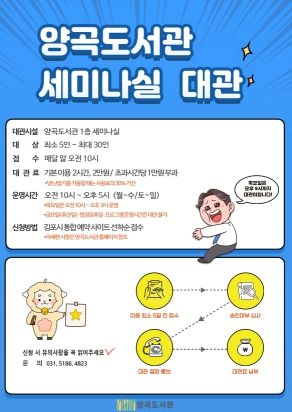 양곡도서관 관계자는, “더욱더 많은 시민분들이 독서 활동 및 지식 공유를 위한 다방면 모임에 양곡도서관 세미나실을 적극 활용하시길 바란다”고 전했다.