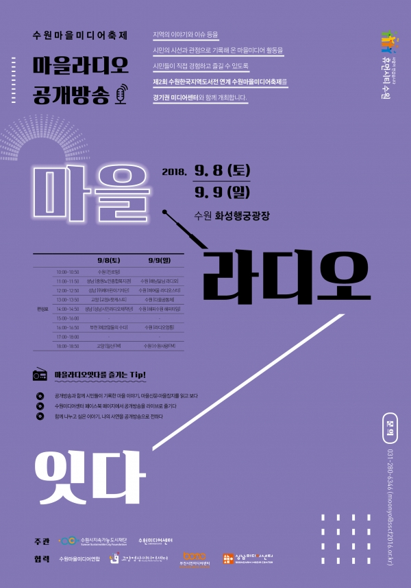 【뉴스라이트】 수원시지속가능도시재단 미디어센터는 8~9일 오전 10시부터 저녁 7시까지 화성행궁광장에서 수원마을미디어축제 마을라디오 공개방송 ‘마을라디오 잇다’를 진행한다.