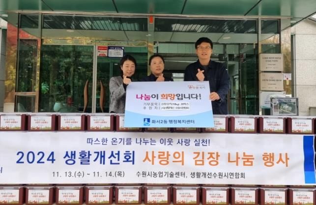 【뉴스라이트 = 조용은 기자】 수원시 팔달구 화서2동은 (사)생활개선수원시연합회가 지난 14일 화서2동 저소득가구를 위한 사랑의 김장김치(10kg) 20상자를 기부했다고 밝혔다.