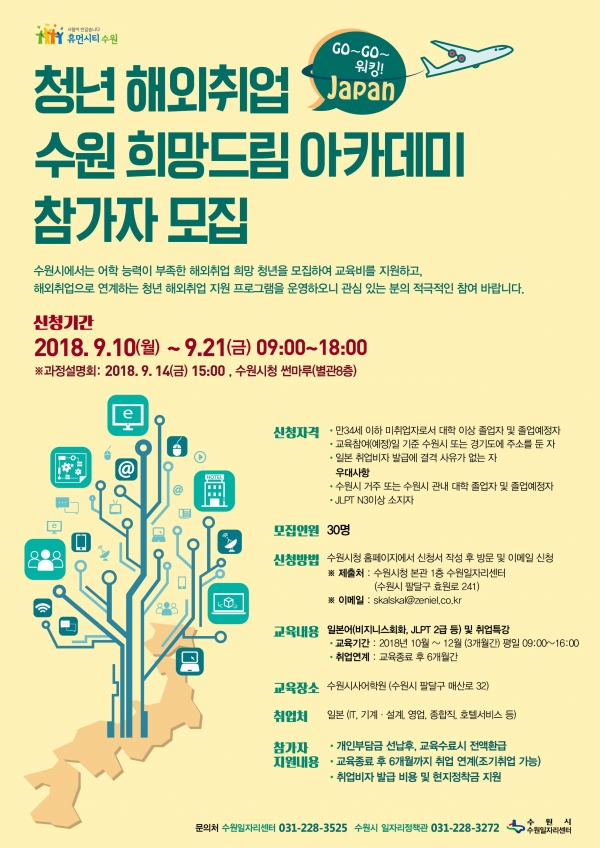 【뉴스라이트】 수원시와 수원일자리센터가 미취업 청년에게 일본에서 일할 기회를 제공하는 ‘GO~GO~ 워킹! Japan(일본), 청년 해외취업 수원희망드림아카데미’ 참여자를 모집한다.