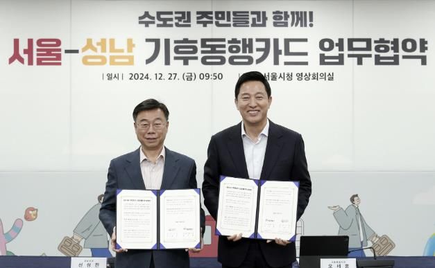【뉴스라이트 = 김정민 기자】 신상진 성남시장은 27일 오세훈 서울시장을 만나 ‘기후동행카드 참여 업무협약’을 체결했다. 이번 협약으로 대중교통을 이용해 서울을 오가는 성남시민의 교통비 부담이 줄어들 전망이다.