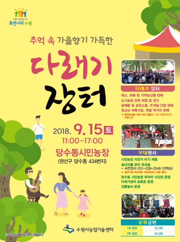 【뉴스라이트】 수원시 농가에서 생산한 싱싱한 농산물과 지역 수공예 작가들의 수공예품을 만날 수 있는 ‘다래기 장터’가 15일 오전 11시부터 오후 4시까지 당수동 시민농장에서 열린다.