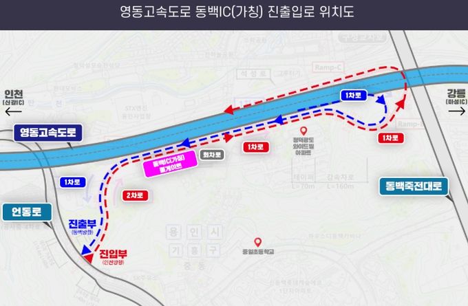 ‘동백IC(가칭)’가 설치되면 기흥구 동백3동 행정복지센터에서 영동고속도로 신갈분기점까지 약 6.3㎞ 구간을 자동차로 8분만에 도달할 수 있다. 현재 영동고속도로 마성IC를 통해 우회하는 13.5㎞ 구간주행에 16분이 소요되는 것과 비교하면 거리로는 약 7.2㎞, 시간으로는 8분을 단축할 수 있게 된다.